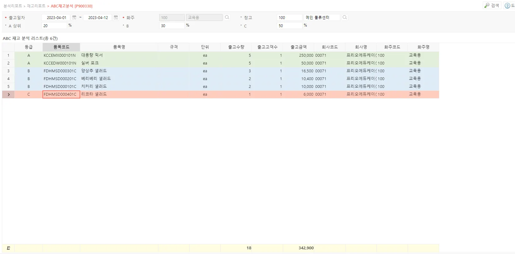 ABC 재고분석은 기간 내 상품의 출고량을 ABC등급으로 구분해 출력할 수 있는 기능입니다.