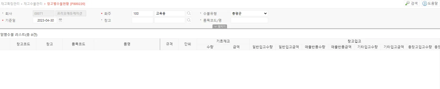 창고별 수불 현황은 각 창고별 수불 내역을 조회할 수 있는 기능입니다.