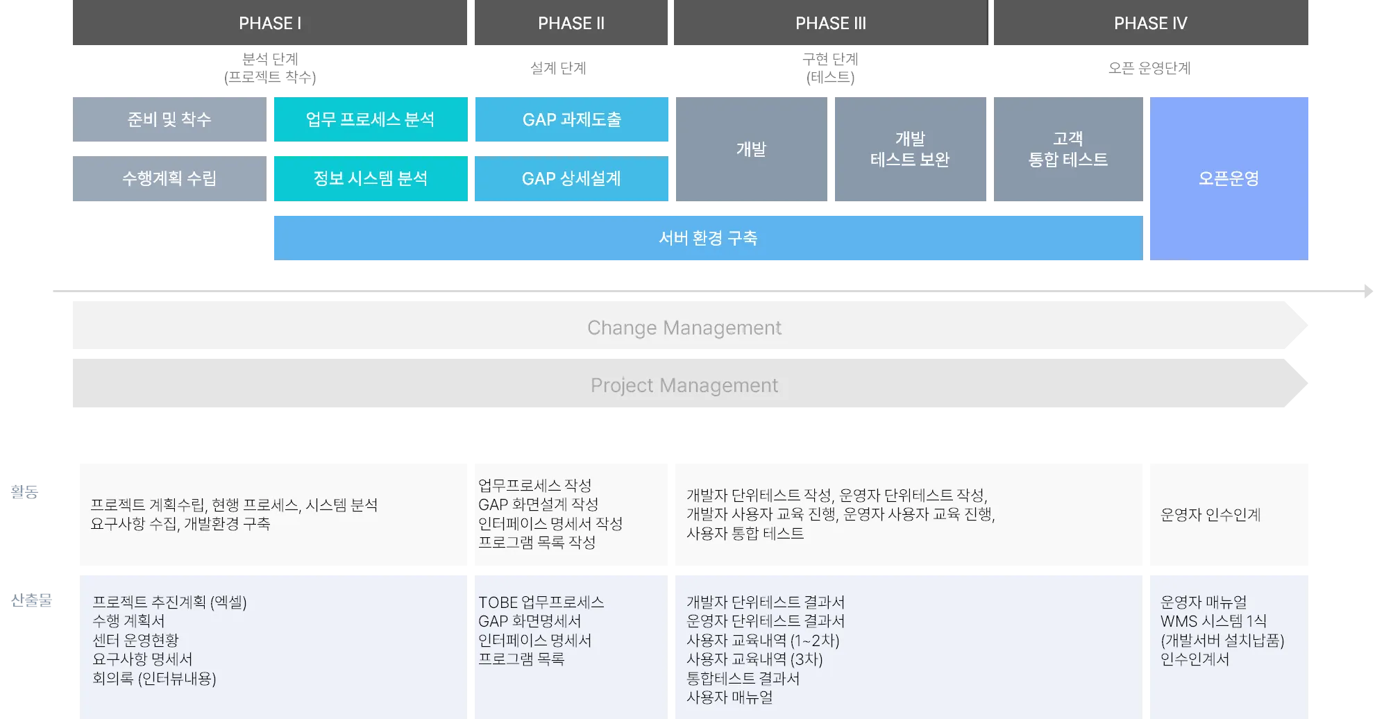 프리오 수행 방법론에 따라 GAP분석, 설계, 개발, 테스트, 오픈 절차를 수행합니다.